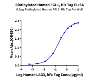 | Bio-activity : | Immobilized Biotinylated Human FGL1, His Tag at 5μg/ml (100μl/well) on the streptavidin precoated plate (5μg/ml). Dose response curve for Human LAG3, hFc Tag with the EC50 of 0.19μg/ml determined by ELISA. |