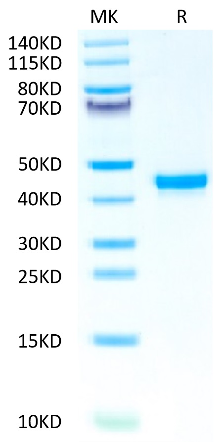 | Molecular Mass : | The protein has a predicted MW of 31.2 kDa. Due to glycosylation, the protein migrates to 38-45 kDa based on Tris-Bis PAGE result. |