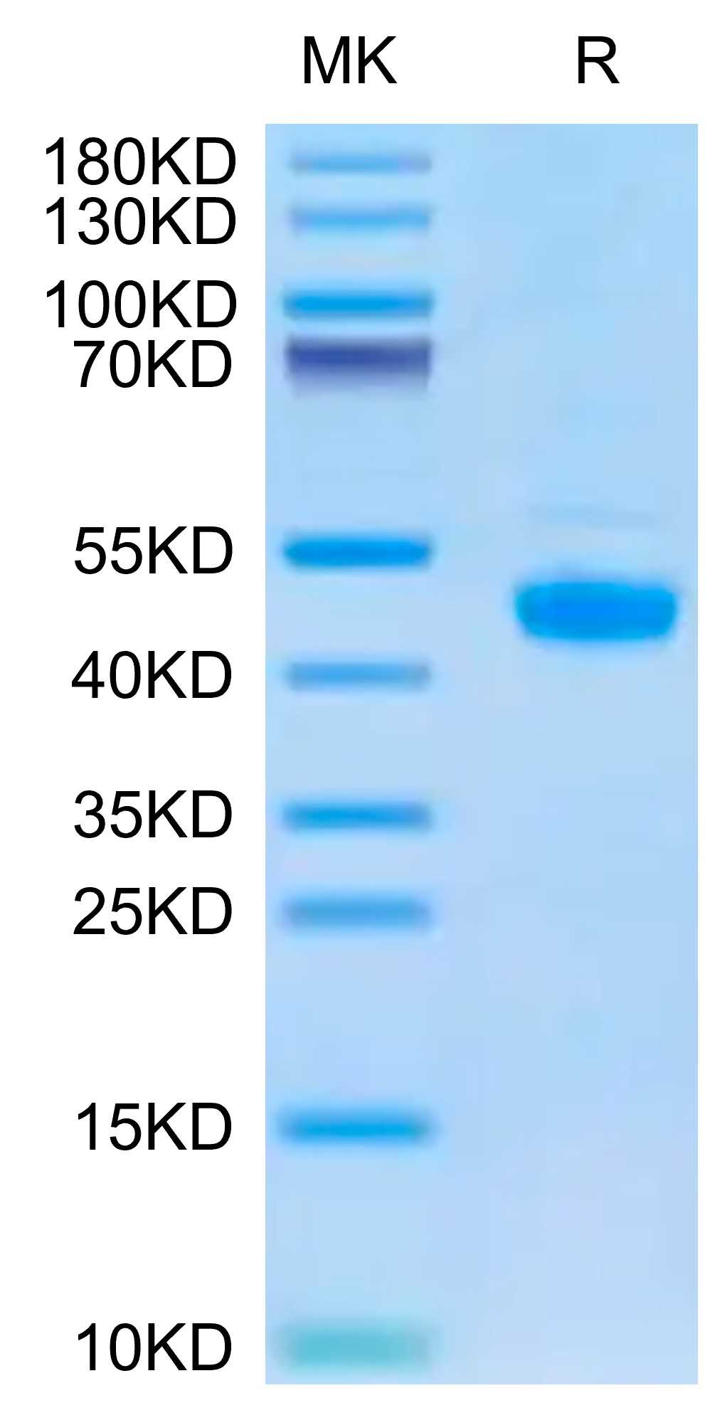 | Molecular Mass : | The protein has a predicted MW of 31.2 kDa. Due to glycosylation, the protein migrates to 40-55 kDa based on Tris-Bis PAGE result. |