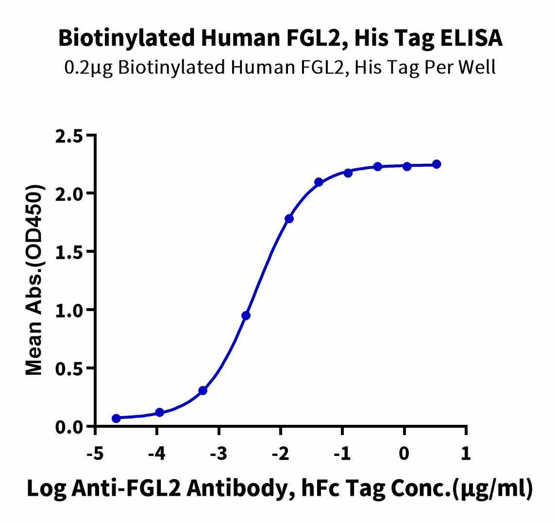 | Bio-activity : | Immobilized Anti-FGL2 Antibody at 5μg/ml (100μl/well) on the plate. Dose response curve for Biotinylated Human FGL2, His Tag with the EC50 of 0.34μg/ml determined by ELISA. |