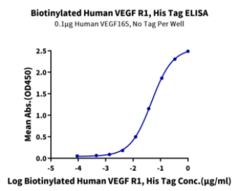 | Bio-activity : | Immobilized Human VEGF165 at 1ug/ml (100ul/well) on the plate. Dose response curve for Biotinylated Human VEGFR1, His Tag with the EC50 of 46.4ng/ml determined by ELISA. |
