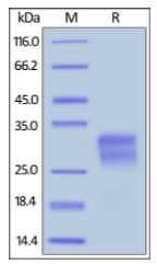 Molecular Mass : | The protein has a calculated MW of 19.9 kDa. The protein migrates as 28-30 kDa and 31-33 kDa under reducing (R) condition (SDS-PAGE) due to glycosylation. |