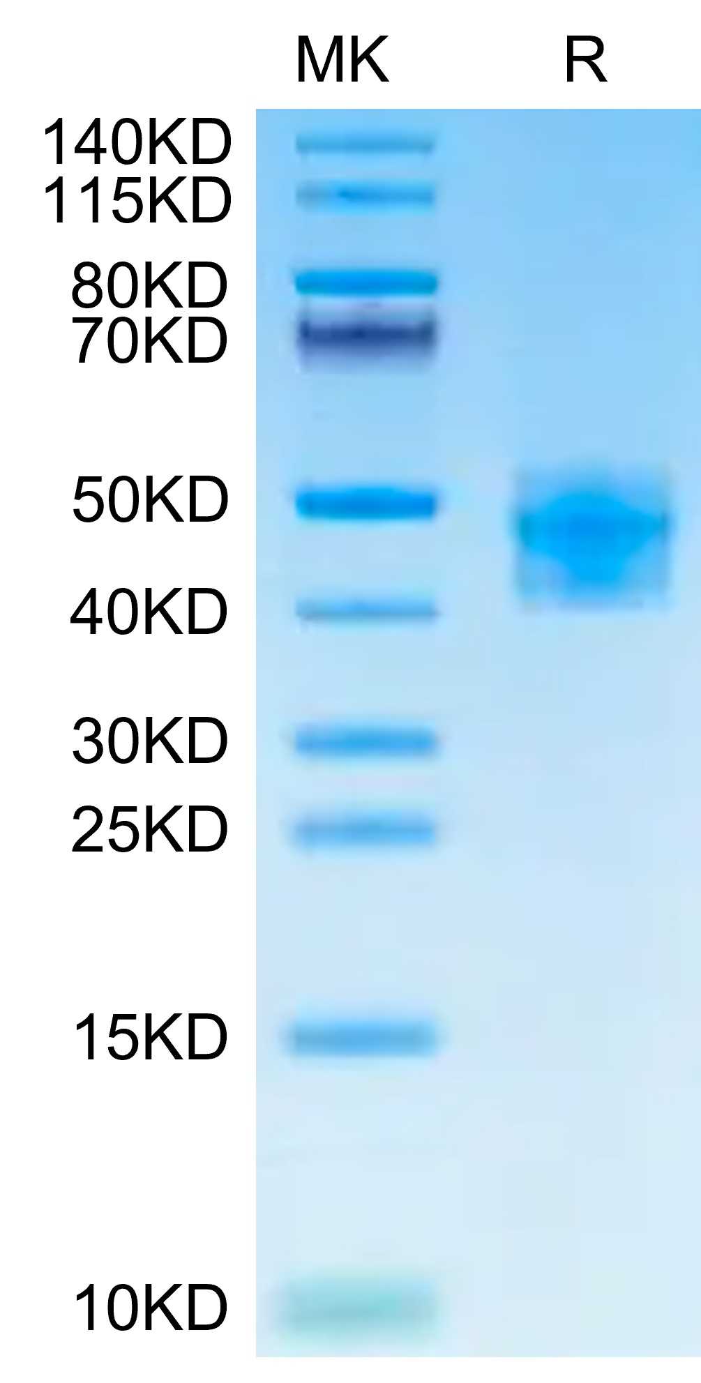 | Molecular Mass : | The protein has a predicted MW of 35.93 kDa. Due to glycosylation, the protein migrates to 40-55 kDa based on Tris-Bis PAGE result. |