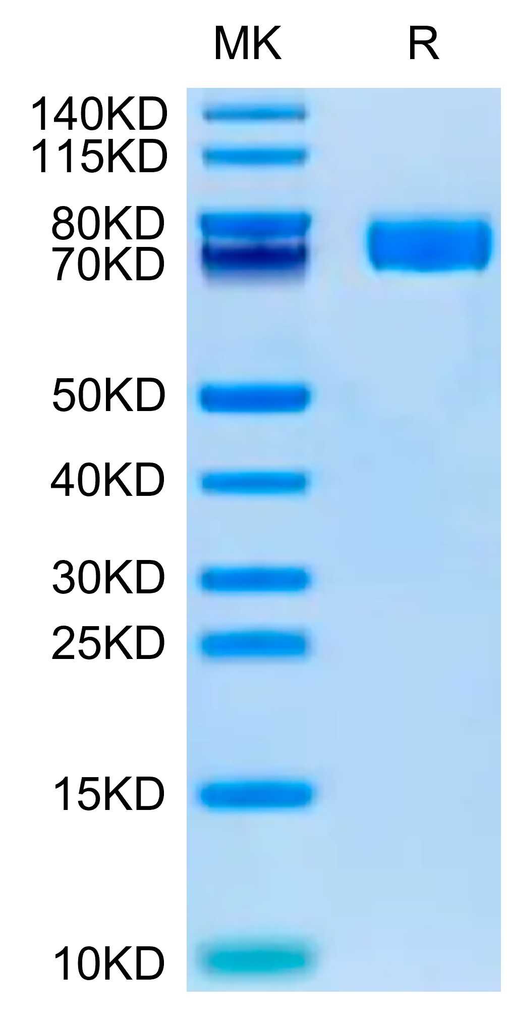 | Molecular Mass : | The protein has a predicted MW of 65.47 kDa. Due to glycosylation, the protein migrates to 70-80 kDa based on Tris-Bis PAGE result. |