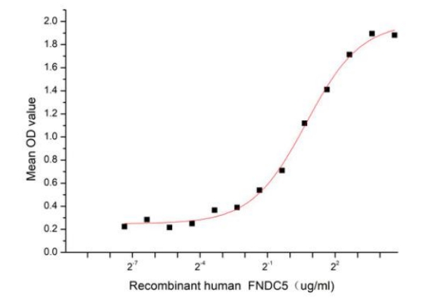 | Bio-activity : | Fibronectin type III domain-containing protein 5, the precursor of irisin, is a protein that is encoded by the FNDC5 gene. FNDC5 is a 12 kDa glycosylated polypeptide hormone that regulate glycolipid metabolism, cardiovascular homeostasis metabolism, stem cell differentiation, and neuronal development. Brain Derived Neurotrophic Factor (BDNF) has been identified as an interactor of FNDC5, thus a functional binding ELISA assay was conducted to detect the interaction of recombinant human FNDC5 and recombinant dog BDNF. Briefly, FNDC5 was diluted serially in PBS with 0.01% BSA (pH 7.4). Duplicate samples of 100 μl were then transferred to BDNF-coated microtiter wells and incubated for 1h at 37°C. Wells were washed with PBST and incubated for 1h with anti-FNDC5 pAb, then aspirated and washed 3 times. After incubation with HRP labelled secondary antibody for 1h at 37°C, wells were aspirated and washed 5 times. With the addition of substrate solution, wells were incubated 15-25 minutes at 37°C. Finally, add 50 µL stop solution to the wells and read at 450/630 nm immediately. The binding activity of recombinant human FNDC5 and recombinant dog BDNF was shown in Figure, the EC50 for this effect is 1.64 ug/mL. |