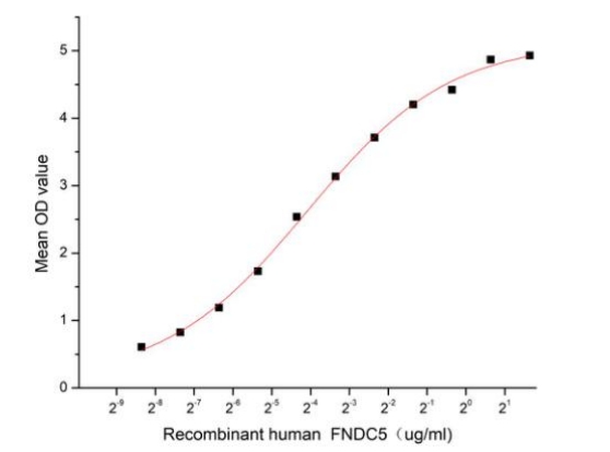 | Bio-activity : | Fibronectin type III domain-containing protein 5, the precursor of irisin, is a protein that is encoded by the FNDC5 gene. FNDC5 is a 12 kDa glycosylated polypeptide hormone that regulate glycolipid metabolism, cardiovascular homeostasis metabolism, stem cell differentiation, and neuronal development. Myostatin (MSTN) has been identified as an interactor of FNDC5, thus a functional binding ELISA assay was conducted to detect the interaction of recombinant human FNDC5 and recombinant human MSTN. Briefly, FNDC5 was diluted serially in PBS with 0.01% BSA (pH 7.4). Duplicate samples of 100 μl were then transferred to MSTN-coated microtiter wells and incubated for 1h at 37°C. Wells were washed with PBST and incubated for 1h with anti-FNDC5 pAb, then aspirated and washed 3 times. After incubation with HRP labelled secondary antibody for 1h at 37°C, wells were aspirated and washed 5 times. With the addition of substrate solution, wells were incubated 15-25 minutes at 37°C. Finally, add 50 µL stop solution to the wells and read at 450/630 nm immediately. The binding activity of recombinant human FNDC5 and recombinant human MSTN was shown in Figure, the EC50 for this effect is 0.03 ug/mL. |