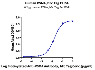 | Bio-activity : | Immobilized Human PSMA, hFc Tag at 2ug/ml (100ul/Well) on the plate. Dose response curve for Biotinylated Anti-PSMA Antibody, hFc Tag with the EC50 of 16.3ng/ml determined by ELISA. |