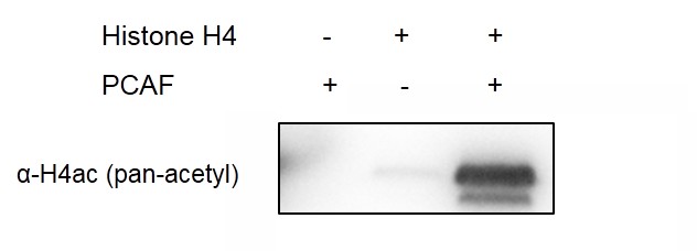 | Bio-activity : | 0.5 μg Histone H4 was incubated with 0 μg (-), 0.5 μg (+) PCAF in a 20 μl reaction system for 2 hours at room temperature. Half of each reaction was run on a 13% SDS-PAGE gel, and products were detected by Western blot. H4ac (pan-acetyl) antibody was used to recognize acetylated histone H4. |