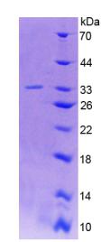34kDa as determined by SDS-PAGE reducing conditions. |