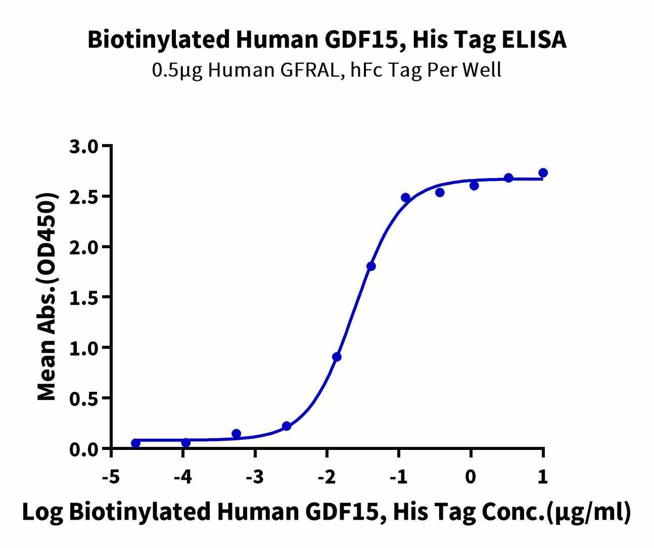 | Bio-activity : | Immobilized Human GFRAL, hFc Tag at 1 μg/ml (100 μl/Well) on the plate. Dose response curve for Biotinylated Human GDF15, His Tag with the EC50 of 24 ng/ml determined by ELISA. |