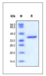 | Molecular Mass : | The protein has a calculated MW of 35 kDa. The protein migrates as 36 kDa under reducing (R) condition (SDS-PAGE). |