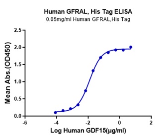 GFR alpha -like (GDNF receptor-alpha-like) is a distant member of the GDNFR family of proteins. Mature human GFR alpha-like is a 376 amino acid (aa) type I transmembrane protein. It contains a 333 aa extracellular domain, a 20 aa transmembrane domain and a 23 aa cytoplasmic domain. GFRAL is a brainstem-restricted receptor for GDF15 which regulates food intake, energy expenditure and body weight in response to metabolic and toxin-induced stresses. |