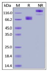 | Molecular Mass : | The protein has a calculated MW of 54.3 kDa. As a result of glycosylation, the protein migrates as 66-85 kDa under reducing (R) condition, and 135-160 kDa under non-reducing (NR) condition (SDS-PAGE). |