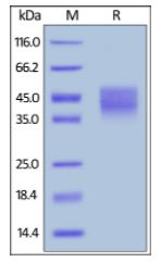 | Molecular Mass : | The protein has a calculated MW of 29.6 kDa. The protein migrates as 40-55 kDa under reducing (R) condition (SDS-PAGE) due to glycosylation. |