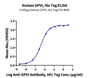 | Bio-activity : | Immobilized Human GPVI, His Tag at 0.5ug/ml (100ul/Well) on the plate. Dose response curve for Anti-GPVI Antibody, hFc Tag with the EC50 of 4.2ng/ml determined by ELISA. |