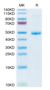 Molecular Mass : | The protein has a predicted MW of 41 kDa. Due to glycosylation, the protein migrates to 48-50 kDa based on Tris-Bis PAGE result. |
