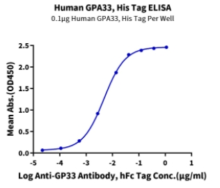 | Bio-activity : | Immobilized Human GPA33, His Tag at 1μg/ml (100μl/well) on the plate. Dose response curve for Anti-GPA33 Antibody, hFc Tag with the EC50 of 4.8ng/ml determined by ELISA. |