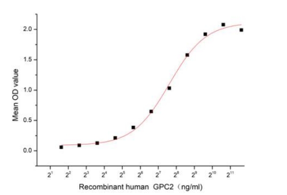 Glypican 2 (GPC2), a member of glypican (GPC) family genes, produces proteoglycan with a glycosylphosphatidylinositol anchor. Level of the various glypicans changes in a stage and tissue specific manner. Syndecan-2 is expressed in cells of mesenchymal origin, neuronal and epithelial cells, and is the predominant syndecan expressed during embryonic development. Human Syndecan-2 is synthesized as a 201 amino acid (aa) core protein with an 18 aa signal sequence, a 126 aa extracellular domain (ECD), a 25 aa transmembrane region and a 32 aa cytoplasmic tail. The human ECD of Syndecan-2 contains three closely-spaced consensus Ser-Gly sequences for the attachment of HS side chains. It shares 76%, 73%, 87%, 78% and 63% aa identity with the ECD of mouse, rat, bovine, canine and chicken Syndecan-2, respectively. SDC1 has been identified as an interactor of GPC2, thus a functional binding ELISA assay was conducted to detect the interaction of recombinant human GPC2 and recombinant bovine SDC1. Briefly, biotin-linked GPC2 were diluted serially in PBS, with 0.01% BSA (pH 7.4). Duplicate samples of 100 μl were then transferred to SDC1-coated microtiter wells and incubated for 1h at 37°C. Wells were washed with PBST 3 times and incubation with Streptavidin-HRP for 30min, then wells were aspirated and washed 5 times. With the addition of substrate solution, wells were incubated 15-25 minutes at 37°C. Finally, add 50 μl stop solution to the wells and read at 450 nm immediately. The EC50 is 195.6 ng/mL. |