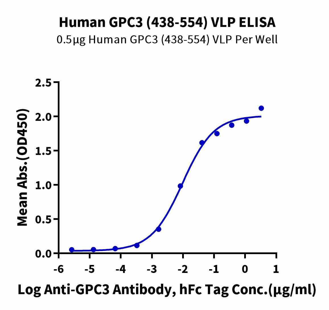 | Bio-activity : | Immobilized Human GPC3 (438-554) VLP at 5μg/ml (100μl/Well) on the plate. Dose response curve for Anti-GPC3 Antibody, hFc Tag with the EC50 of 9.7ng/ml determined by ELISA. |