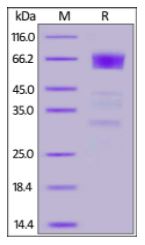 Molecular Mass : | The protein has a calculated MW of 46.5 kDa. The protein migrates as 55-67 kDa under reducing (R) condition (SDS-PAGE) due to glycosylation. |
