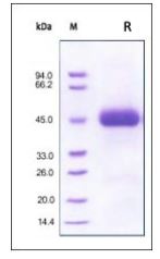 | Molecular Mass : | The protein has a calculated MW of 42 kDa. The protein migrates as 45 kDa under reducing (R) condition (SDS-PAGE) due to glycosylation. |