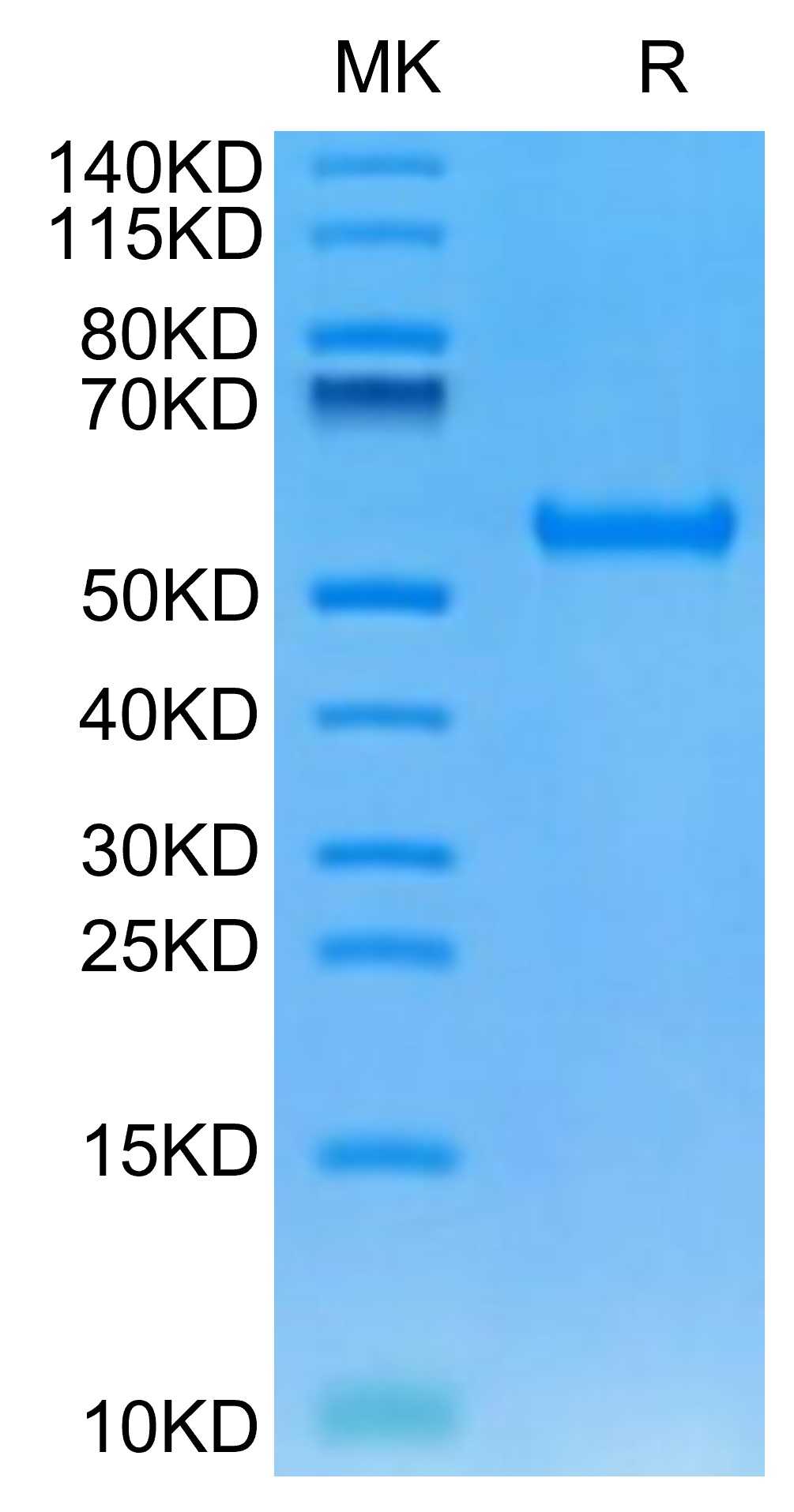 | Molecular Mass : | The protein has a predicted MW of 50.20 kDa. Due to glycosylation, the protein migrates to 55-60 kDa based on Tris-Bis PAGE result. |