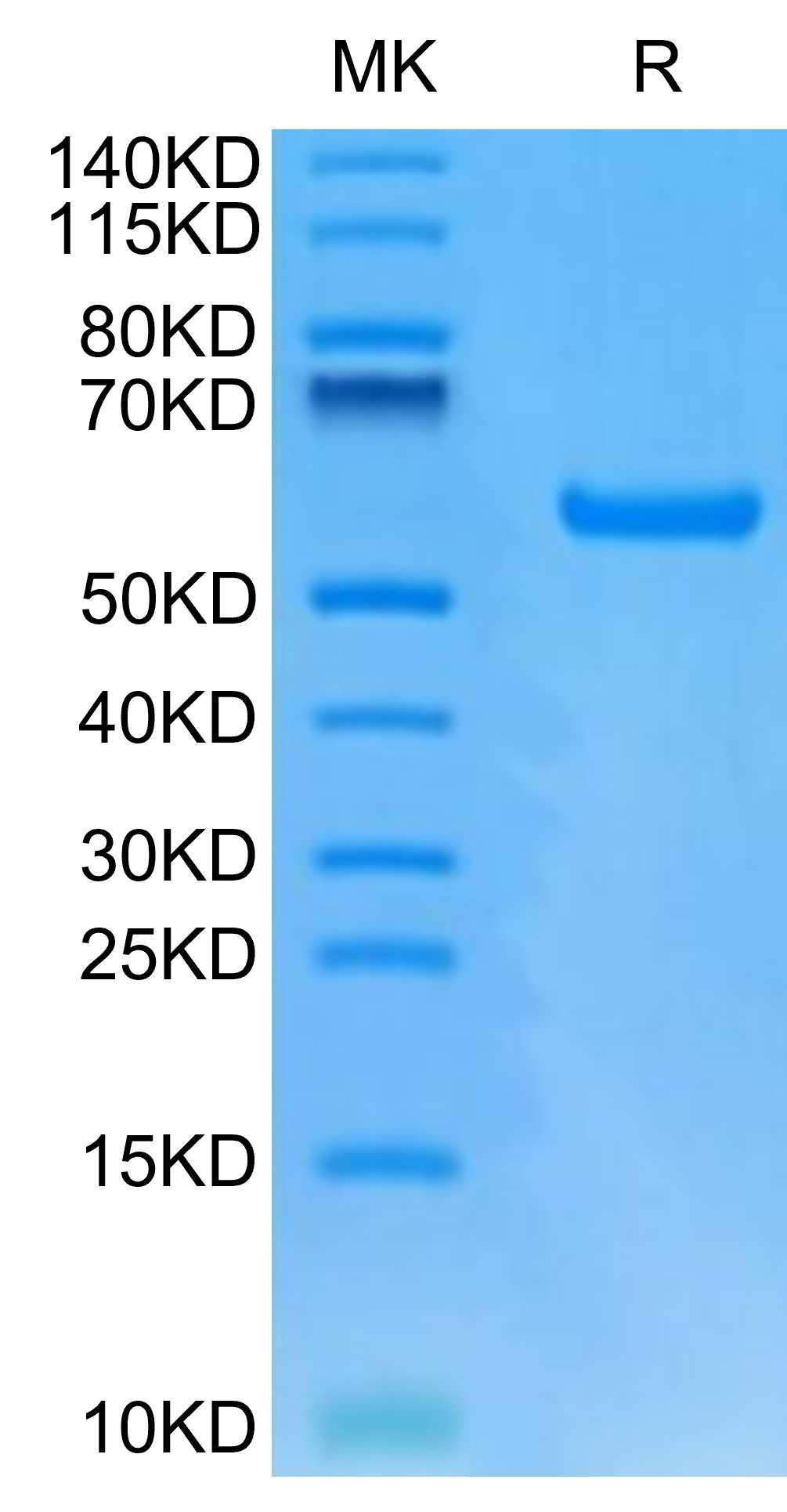 | Molecular Mass : | The protein has a predicted MW of 50.40 kDa. Due to glycosylation, the protein migrates to 55-63 kDa based on Tris-Bis PAGE result. |