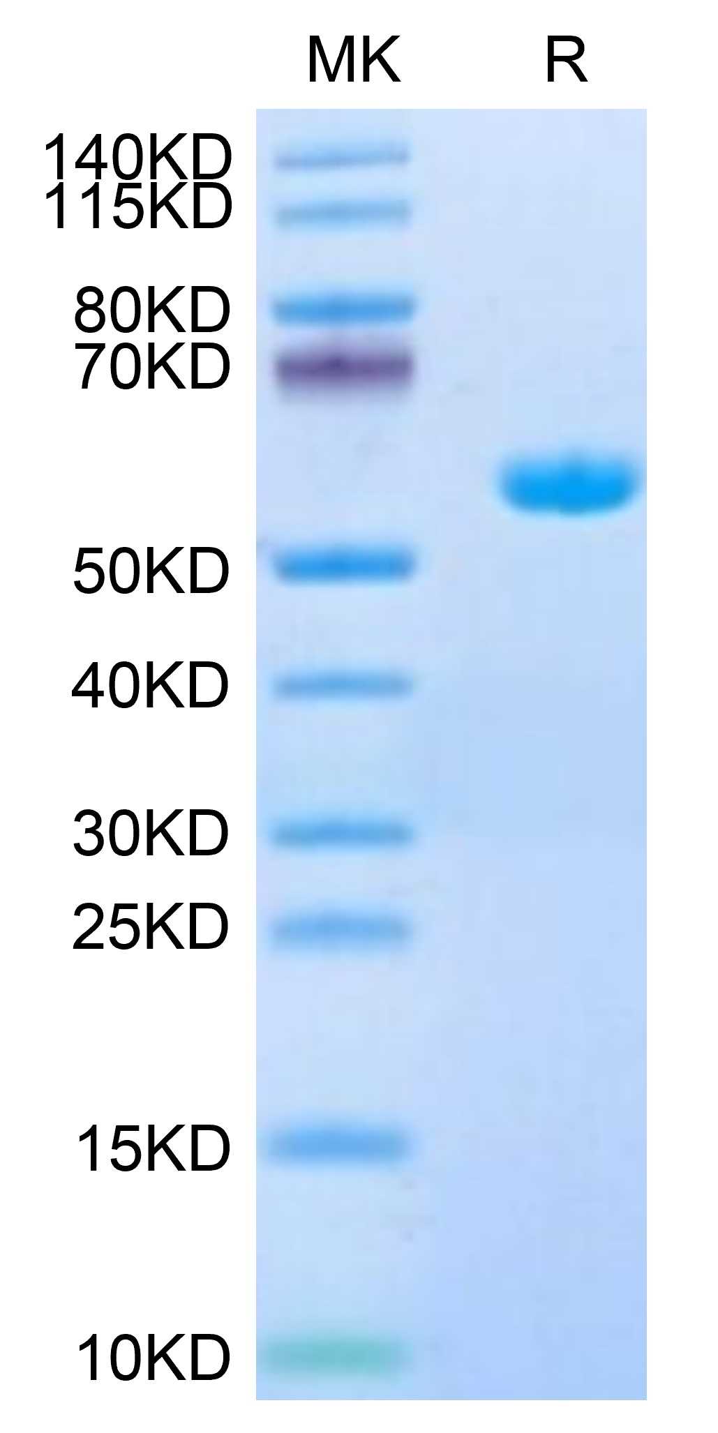 | Molecular Mass : | The protein has a predicted MW of 50.4 kDa. Due to glycosylation, the protein migrates to 51-60 kDa based on Tris-Bis PAGE result. |
