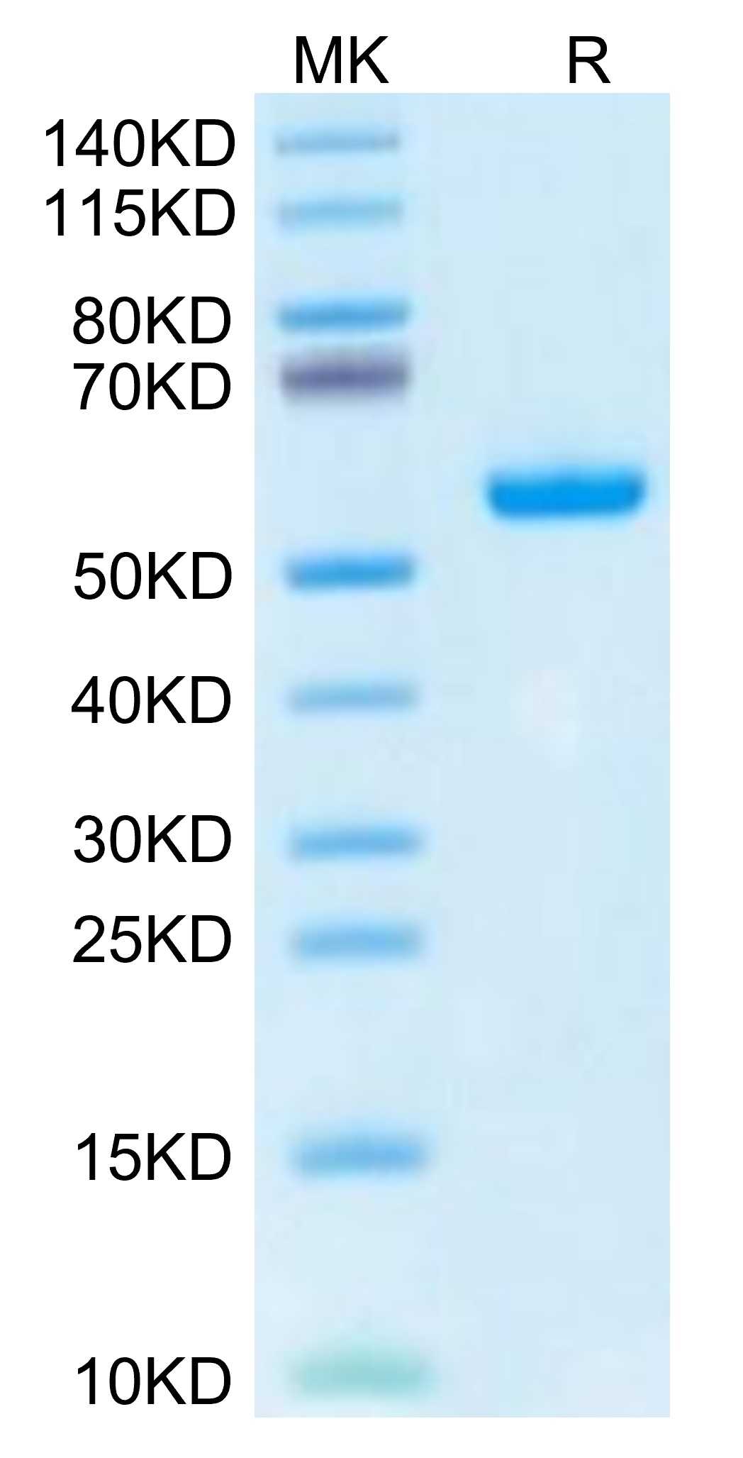 | Molecular Mass : | The protein has a predicted MW of 50.70 kDa. Due to glycosylation, the protein migrates to 53-63 kDa based on Tris-Bis PAGE result. |