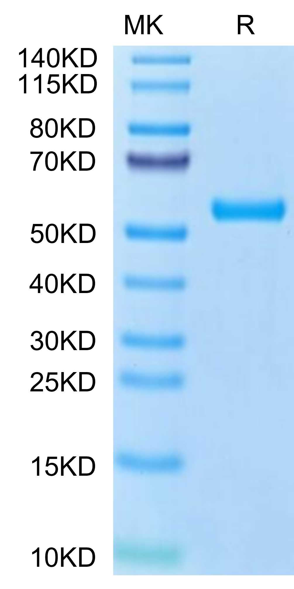| Molecular Mass : | The protein has a predicted MW of 50.40 kDa. Due to glycosylation, the protein migrates to 53-63 kDa based on Tris-Bis PAGE result. |