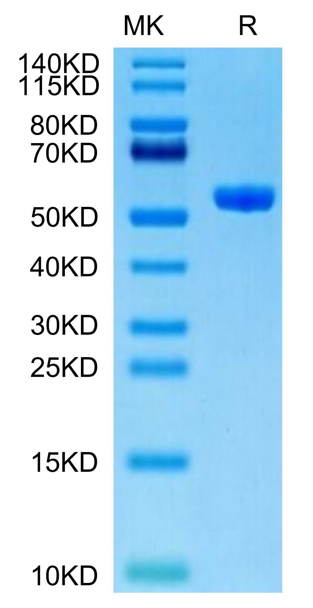 | Molecular Mass : | The protein has a predicted MW of 50.30 kDa. Due to glycosylation, the protein migrates to 52-62 kDa based on Tris-Bis PAGE result. |