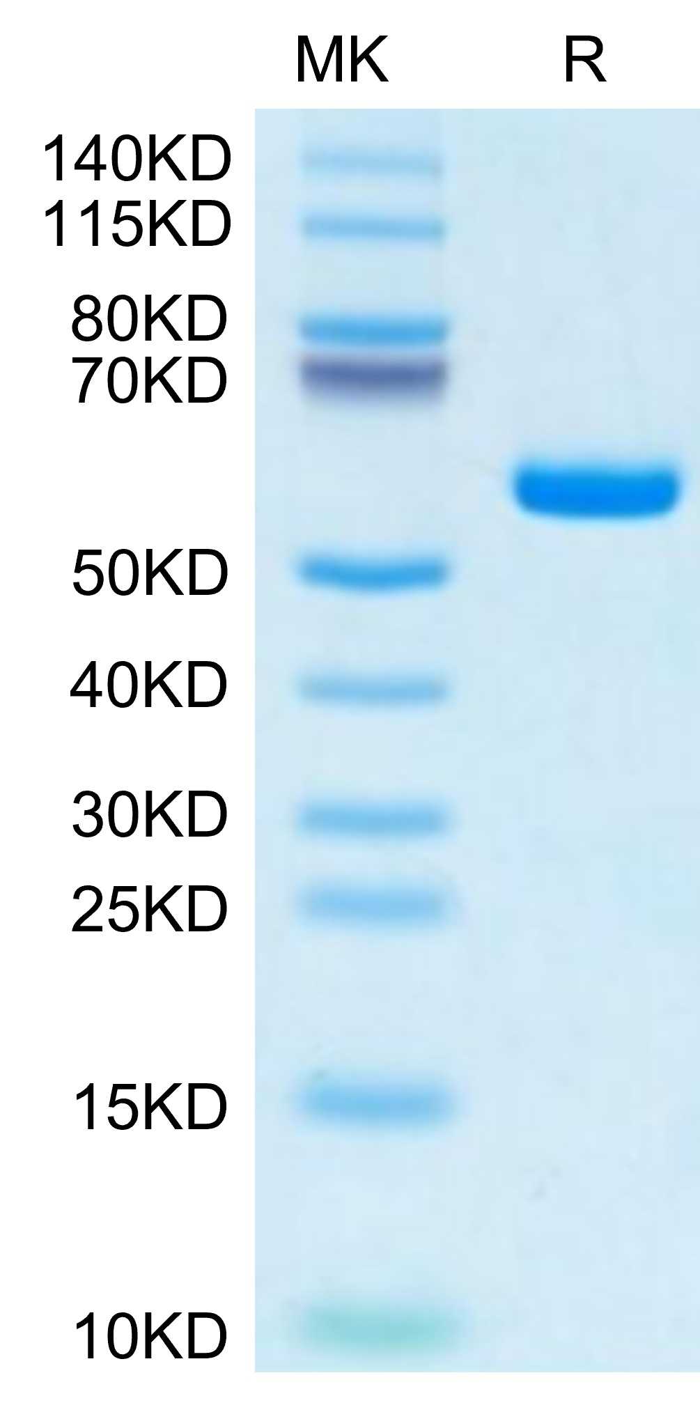 | Molecular Mass : | The protein has a predicted MW of 50.30 kDa. Due to glycosylation, the protein migrates to 53-63 kDa based on Tris-Bis PAGE result. |