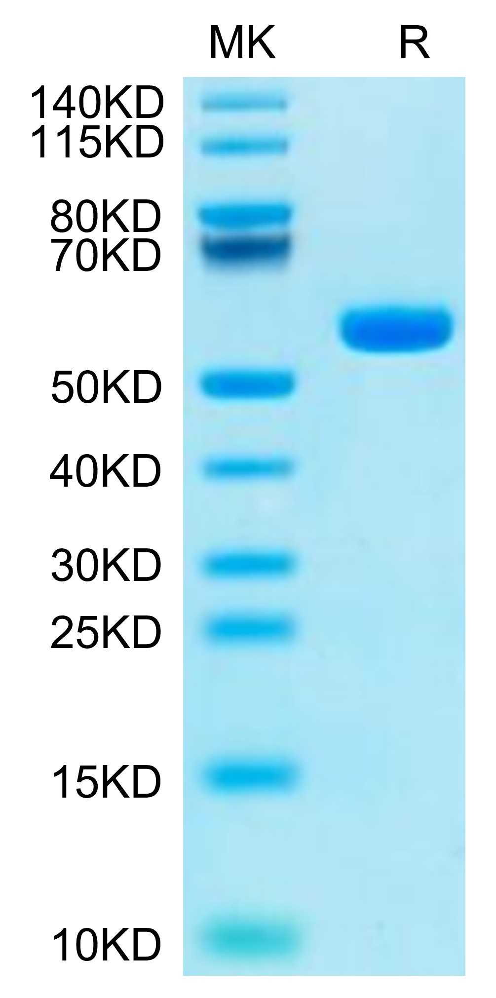 | Molecular Mass : | The protein has a predicted MW of 50.30 kDa. Due to glycosylation, the protein migrates to 53-63 kDa based on Tris-Bis PAGE result. |