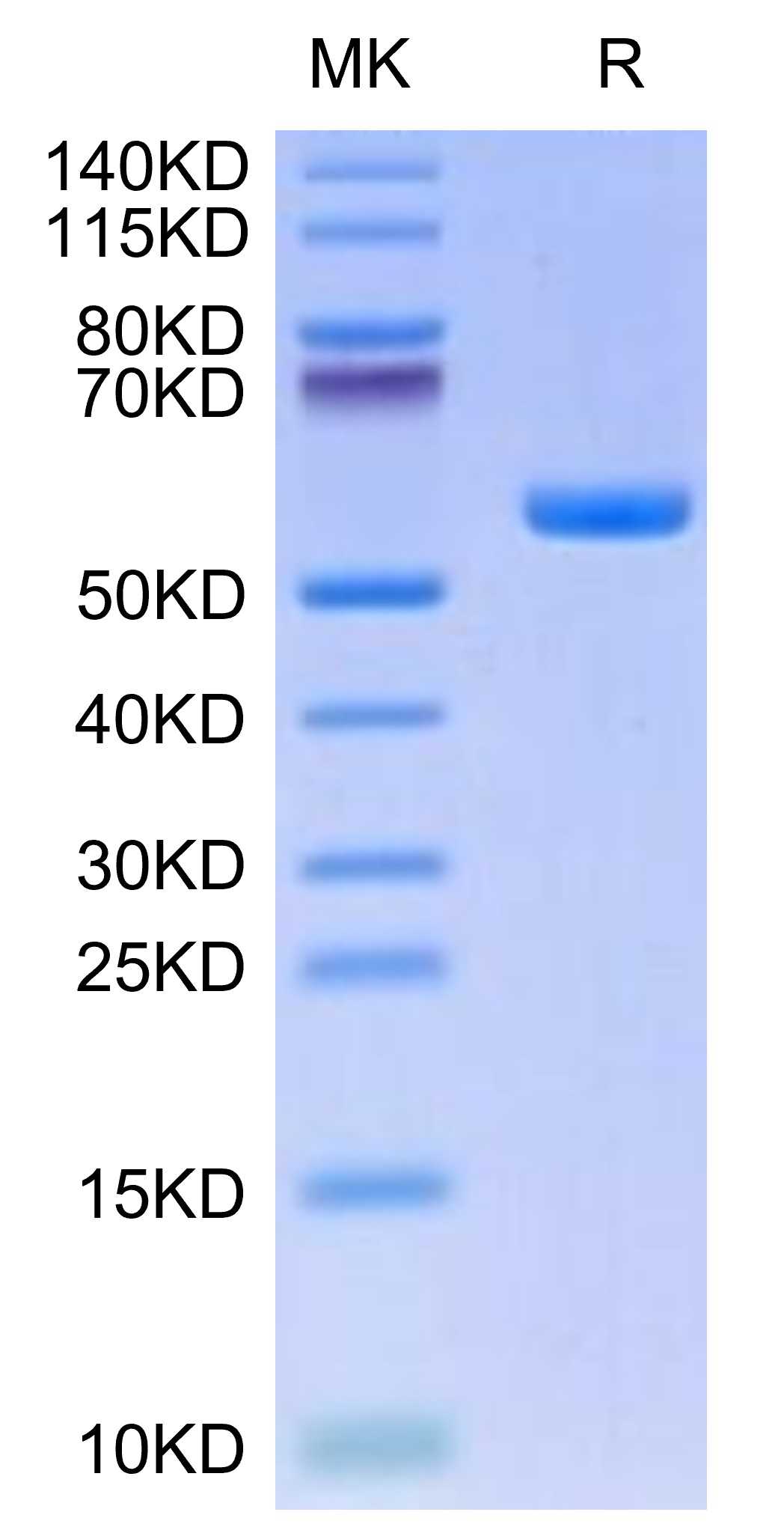 | Molecular Mass : | The protein has a predicted MW of 50.2 kDa. Due to glycosylation, the protein migrates to 56-65 kDa based on Tris-Bis PAGE result. |