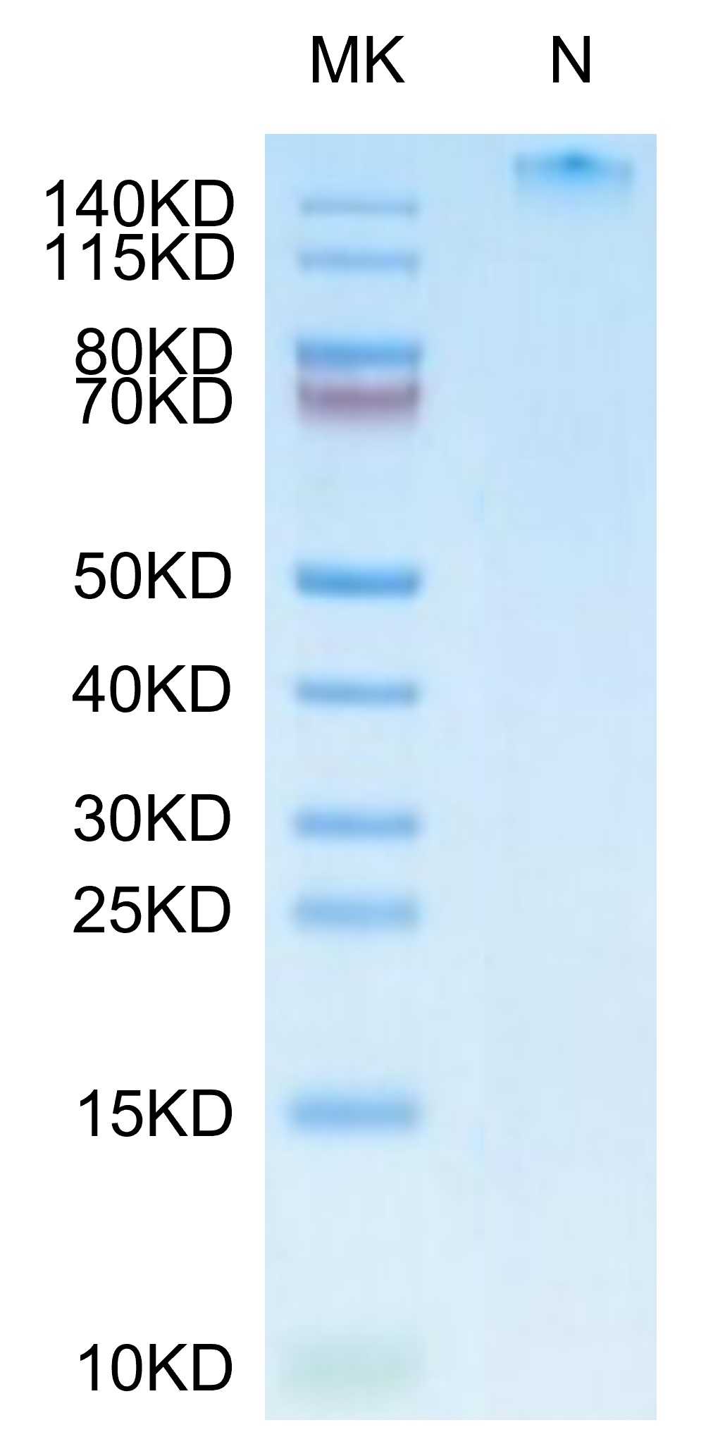 | Molecular Mass : | The protein has a predicted MW of 258 kDa. Due to glycosylation, the protein migrates to 260-265 kDa under Non reducing (N) condition based on Tris-Bis PAGE result. |