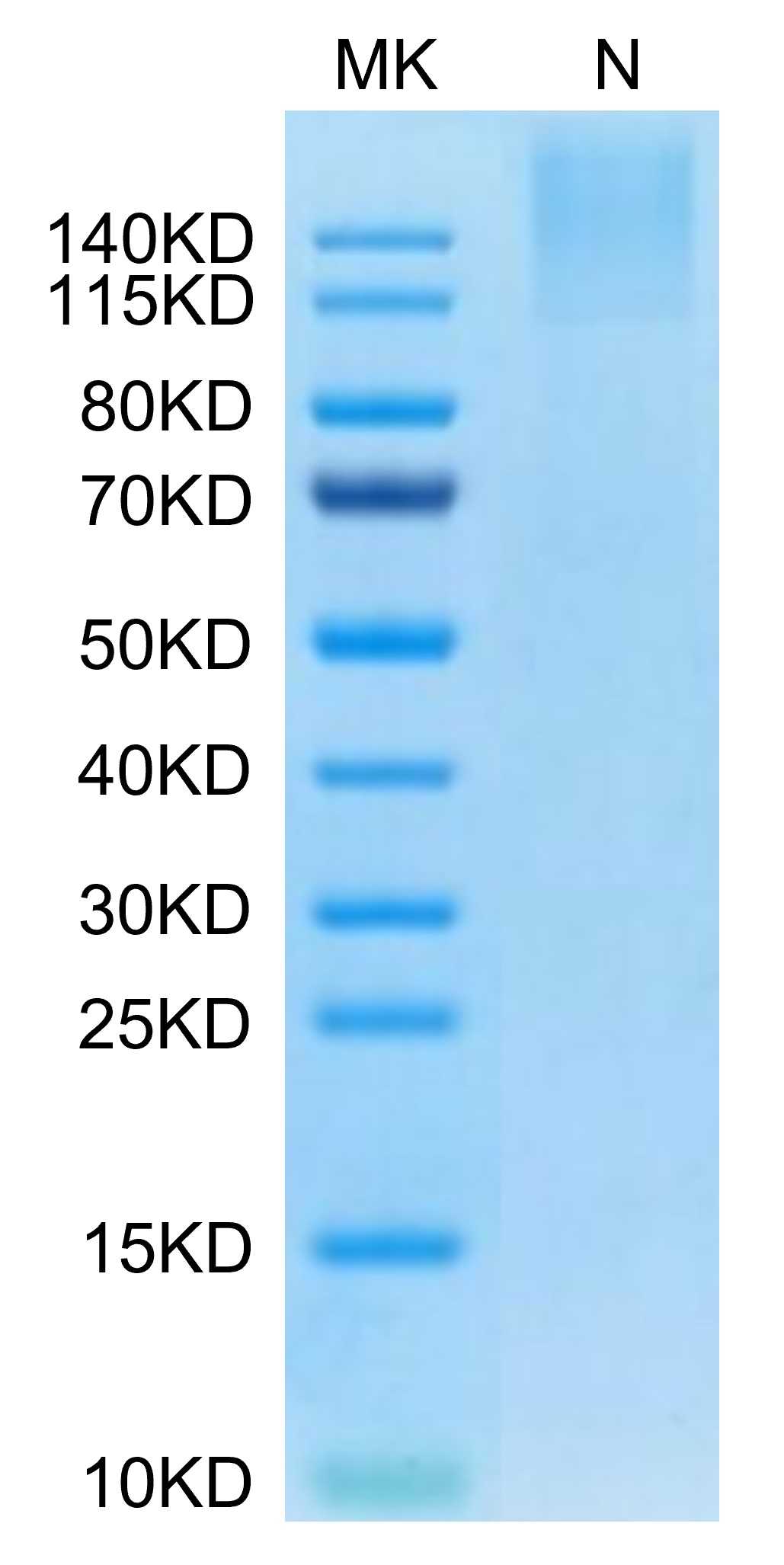 | Molecular Mass : | The protein has a predicted MW of 258 kDa. Due to glycosylation, the protein migrates to 260-265 kDa under Non reducing (N) condition based on Tris-Bis PAGE result. |