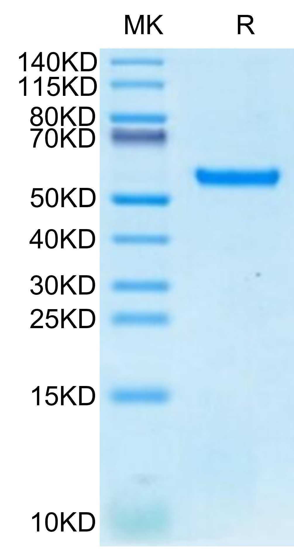 | Molecular Mass : | The protein has a predicted MW of 50.20 kDa. Due to glycosylation, the protein migrates to 55-60 kDa based on Tris-Bis PAGE result. |