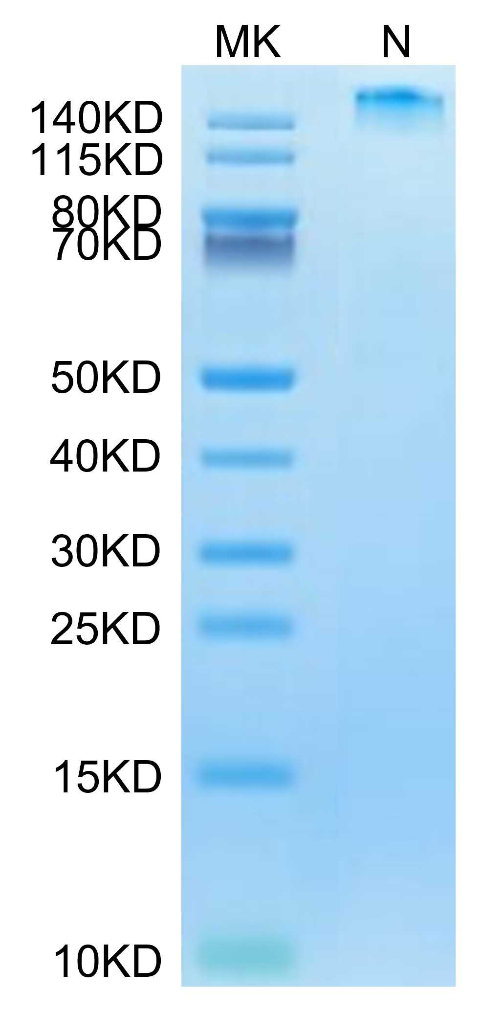 | Molecular Mass : | The protein has a predicted MW of 258 kDa. Due to glycosylation, the protein migrates to 260-265 kDa under Non reducing (N) condition based on Tris-Bis PAGE result. |