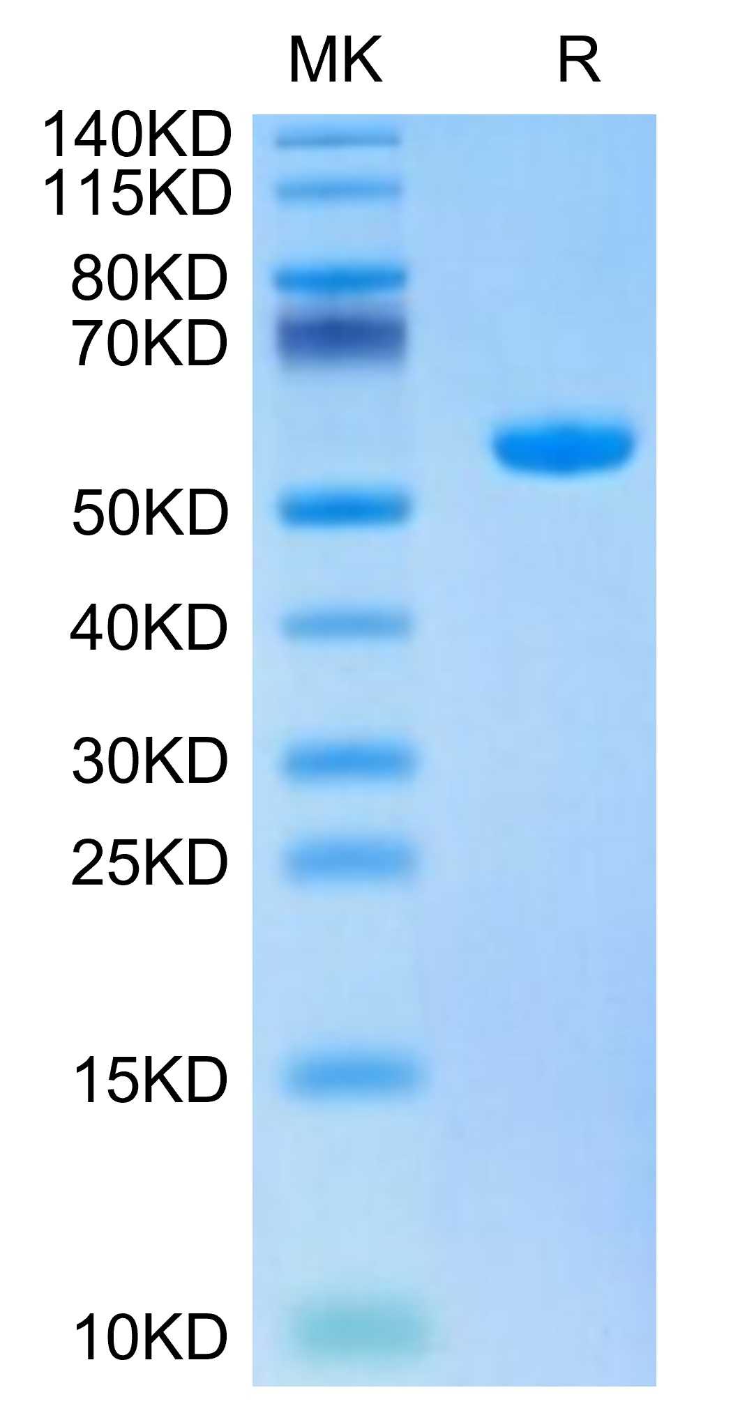 | Molecular Mass : | The protein has a predicted MW of 50.5 kDa. Due to glycosylation, the protein migrates to 52-62 kDa based on Tris-Bis PAGE result. |