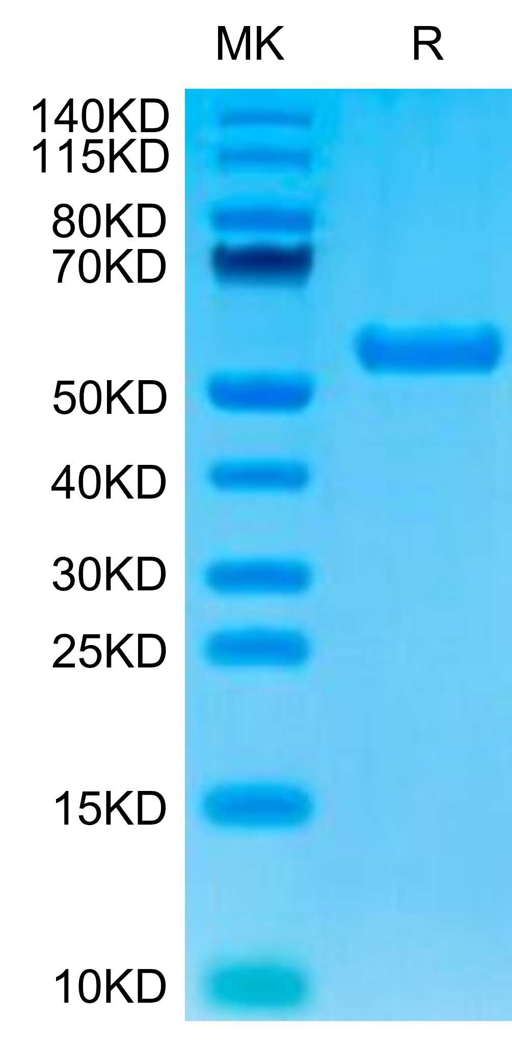 | Molecular Mass : | The protein has a predicted MW of 50.6 kDa. Due to glycosylation, the protein migrates to 53-63 kDa based on Tris-Bis PAGE result. |