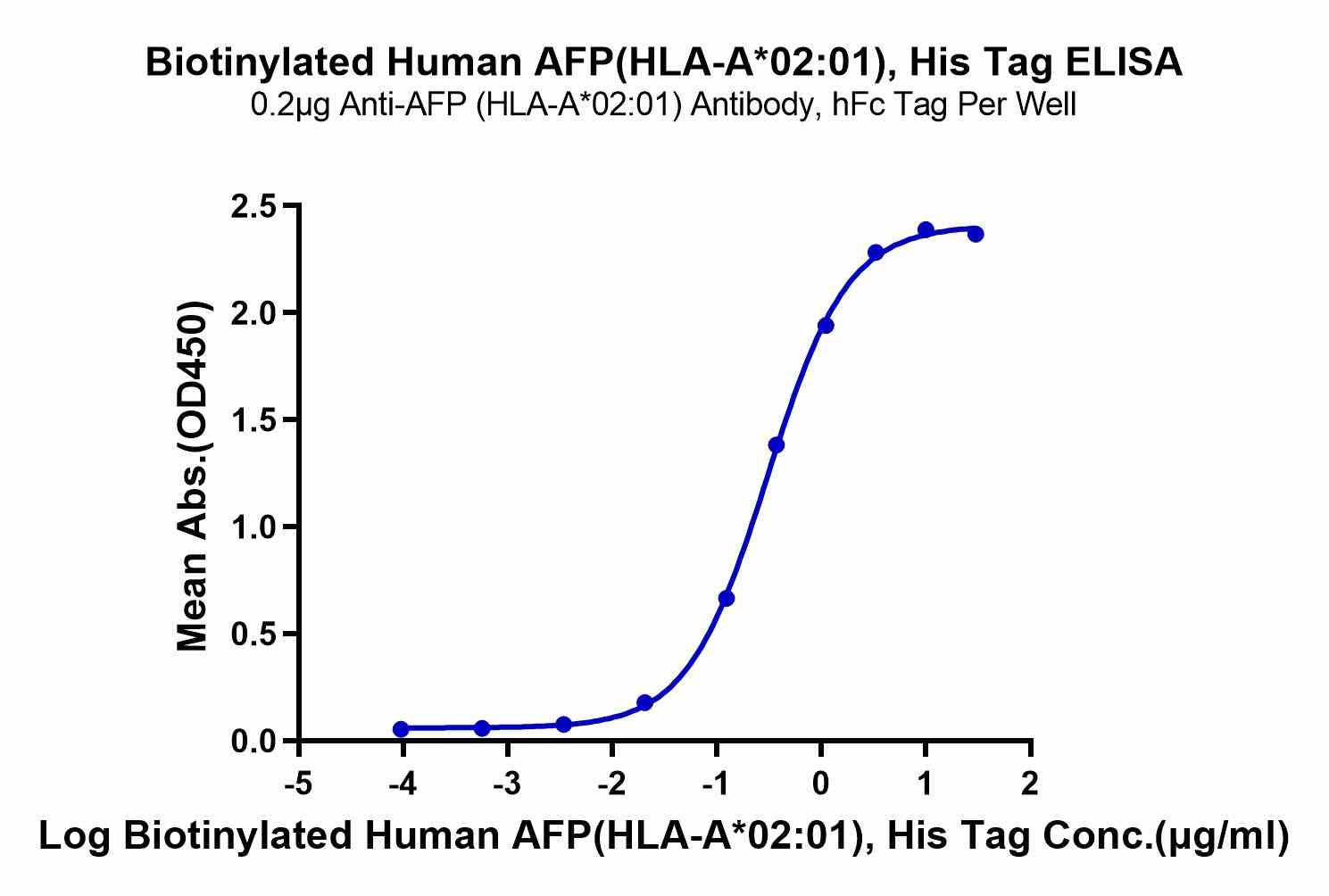 | Bio-activity : | Immobilized Anti-HLA-A*02:01&B2M&AFP (FMNKFIYEI) Antibody, hFc Tag at 2μg/ml (100μl/Well) on the plate. Dose response curve for Biotinylated Human HLA-A*02:01&B2M&AFP (FMNKFIYEI) Monomer, His Tag with the EC50 of 0.31μg/ml determined by ELISA. |