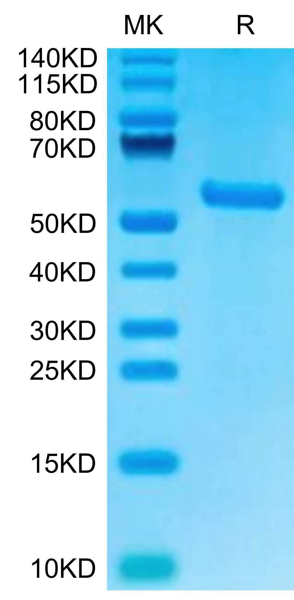 | Molecular Mass : | The protein has a predicted MW of 50.4 kDa. Due to glycosylation, the protein migrates to 53-63 kDa based on Tris-Bis PAGE result. |