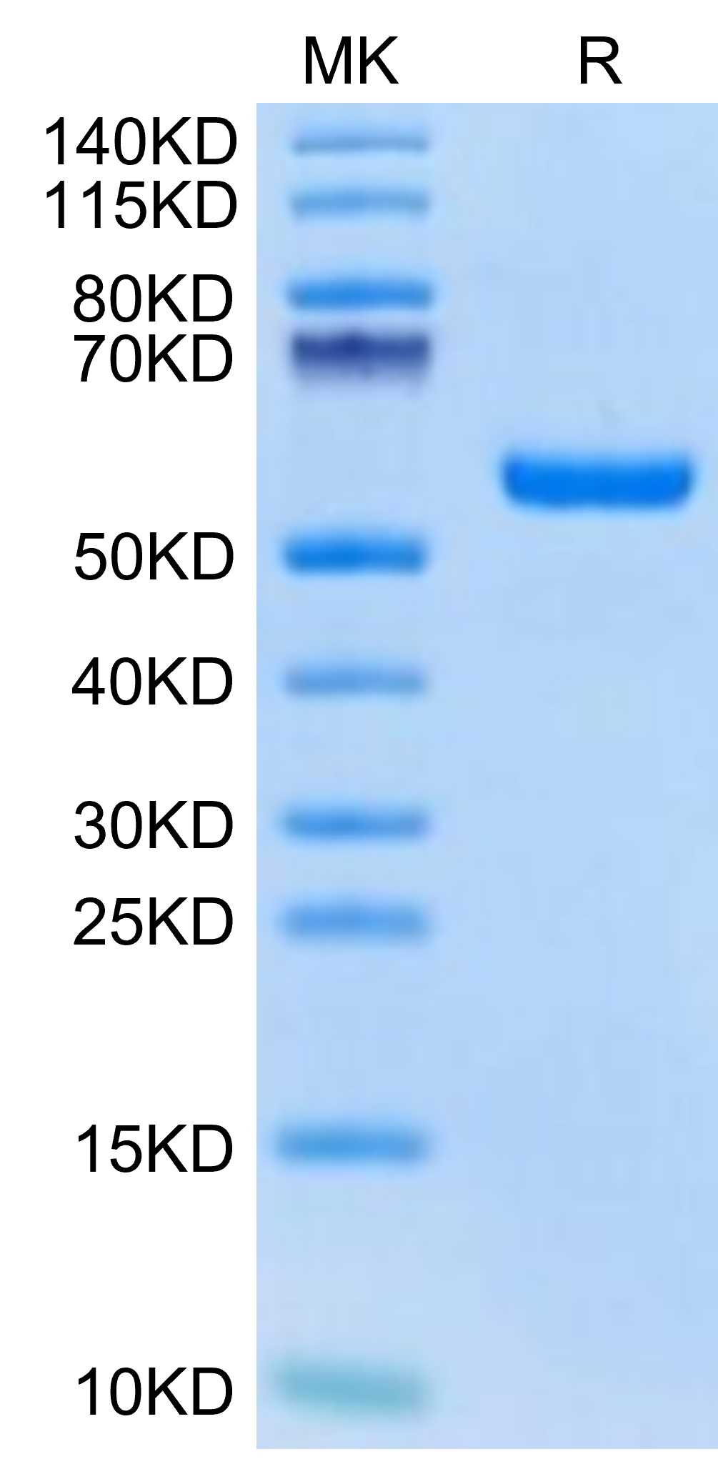 | Molecular Mass : | The protein has a predicted MW of 50.5 kDa. Due to glycosylation, the protein migrates to 55-63 kDa based on Tris-Bis PAGE result. |