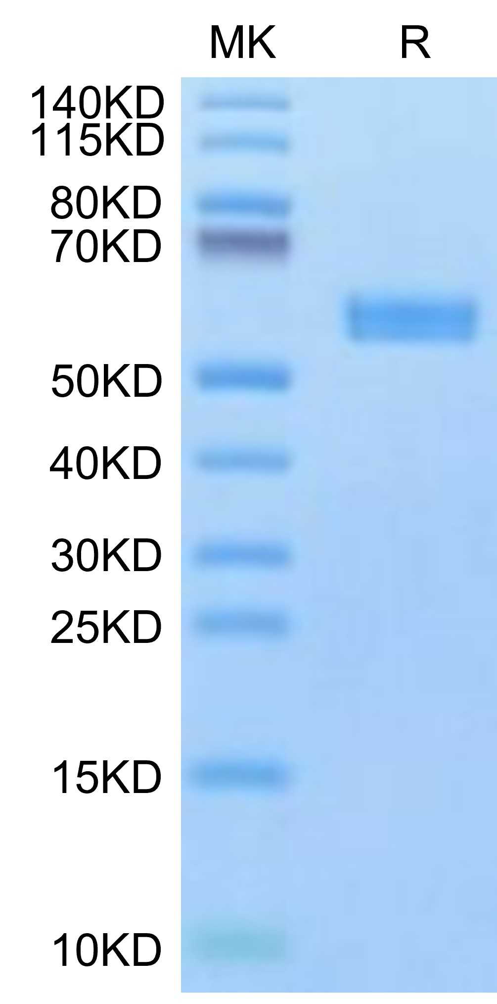 | Molecular Mass : | The protein has a predicted MW of 50.20 kDa. Due to glycosylation, the protein migrates to 55-65 kDa based on Tris-Bis PAGE result. |