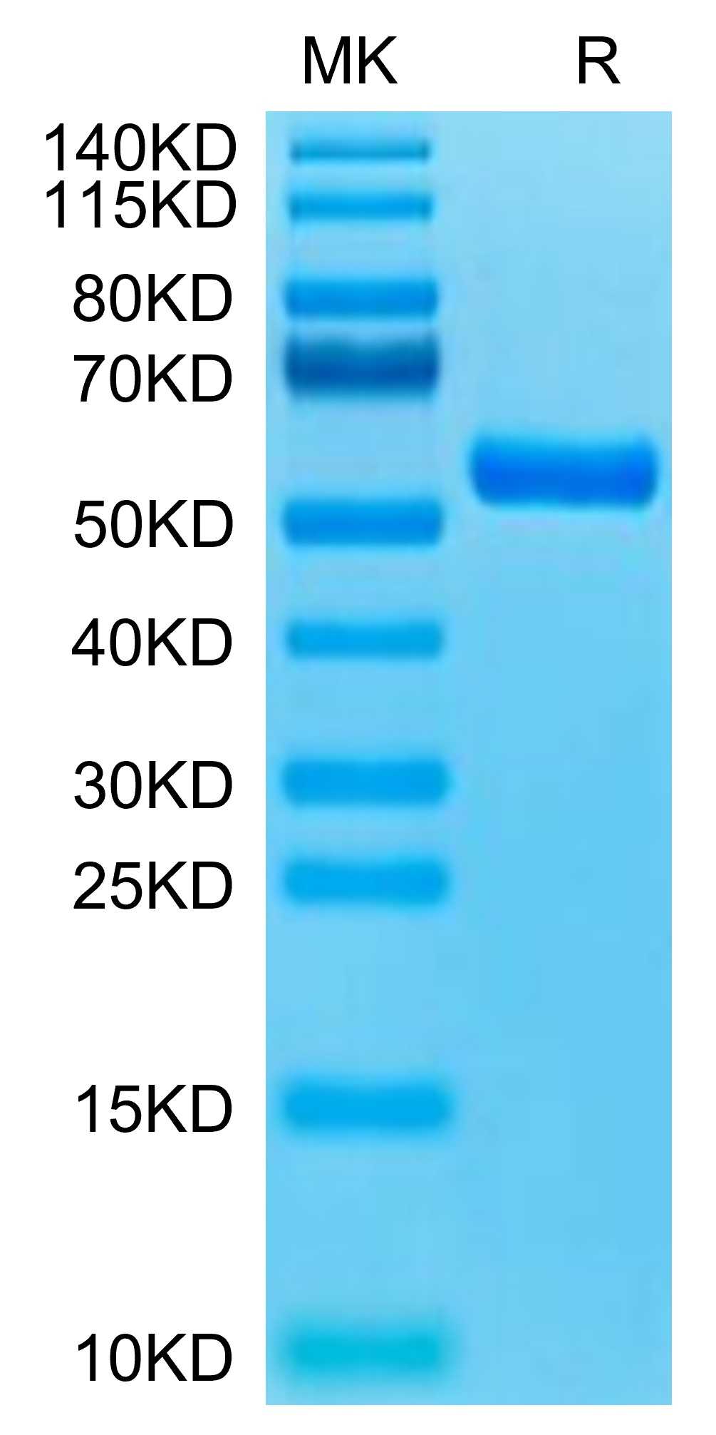 | Molecular Mass : | The protein has a predicted MW of 50.30 kDa. Due to glycosylation, the protein migrates to 53-63 kDa based on Tris-Bis PAGE result. |