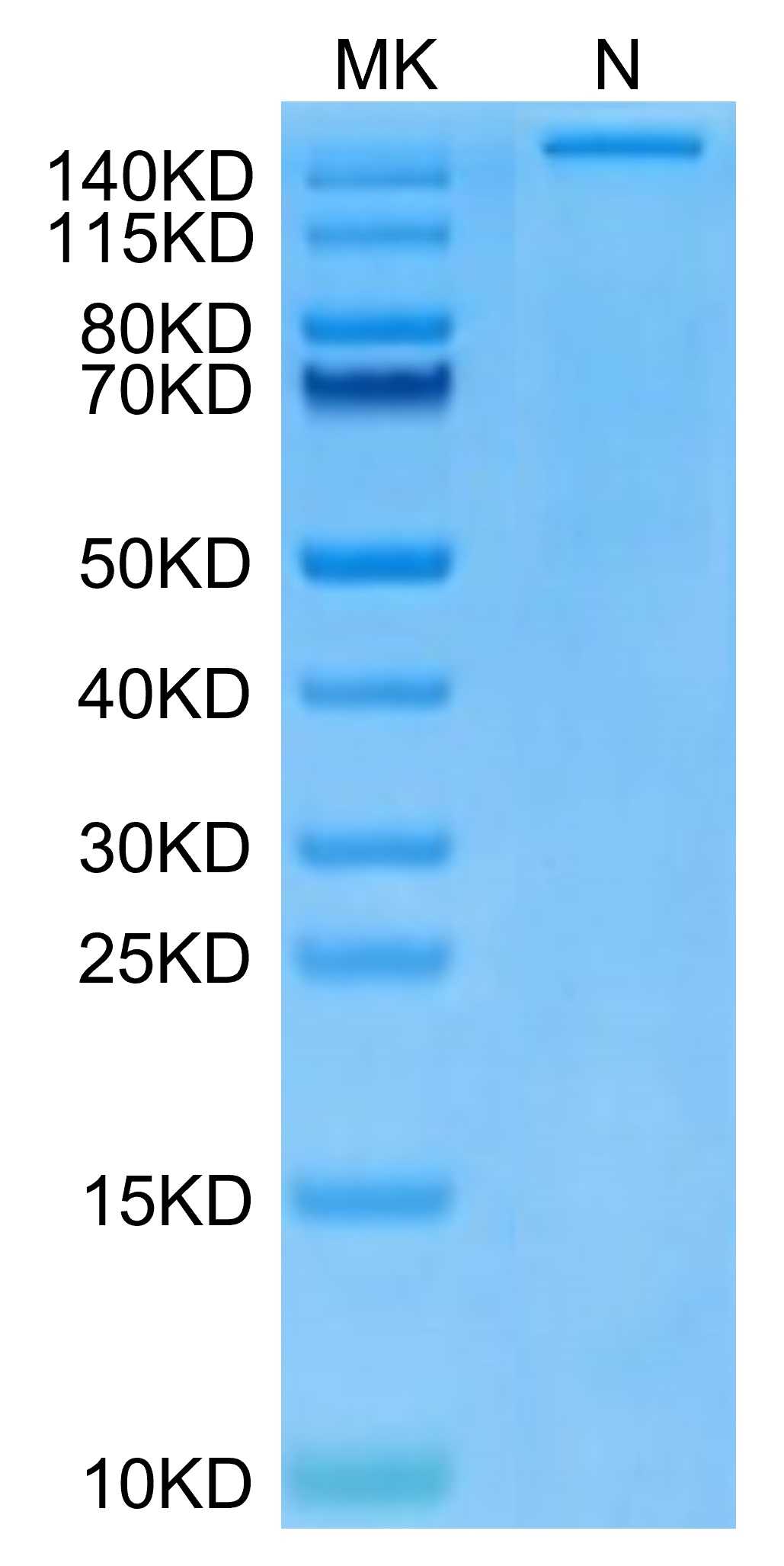 | Molecular Mass : | The protein has a predicted MW of 258 kDa. Due to glycosylation, the protein migrates to 260-265 kDa under Non reducing (N) condition based on Tris-Bis PAGE result. |