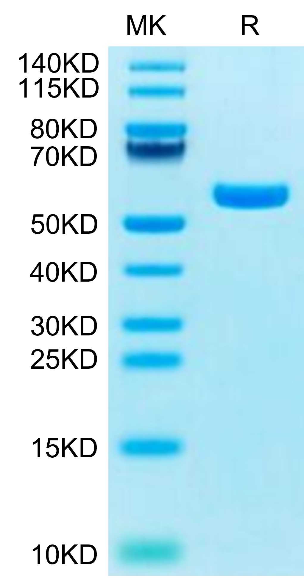 | Molecular Mass : | The protein has a predicted MW of 50.30 kDa. Due to glycosylation, the protein migrates to 53-63 kDa based on Tris-Bis PAGE result. |