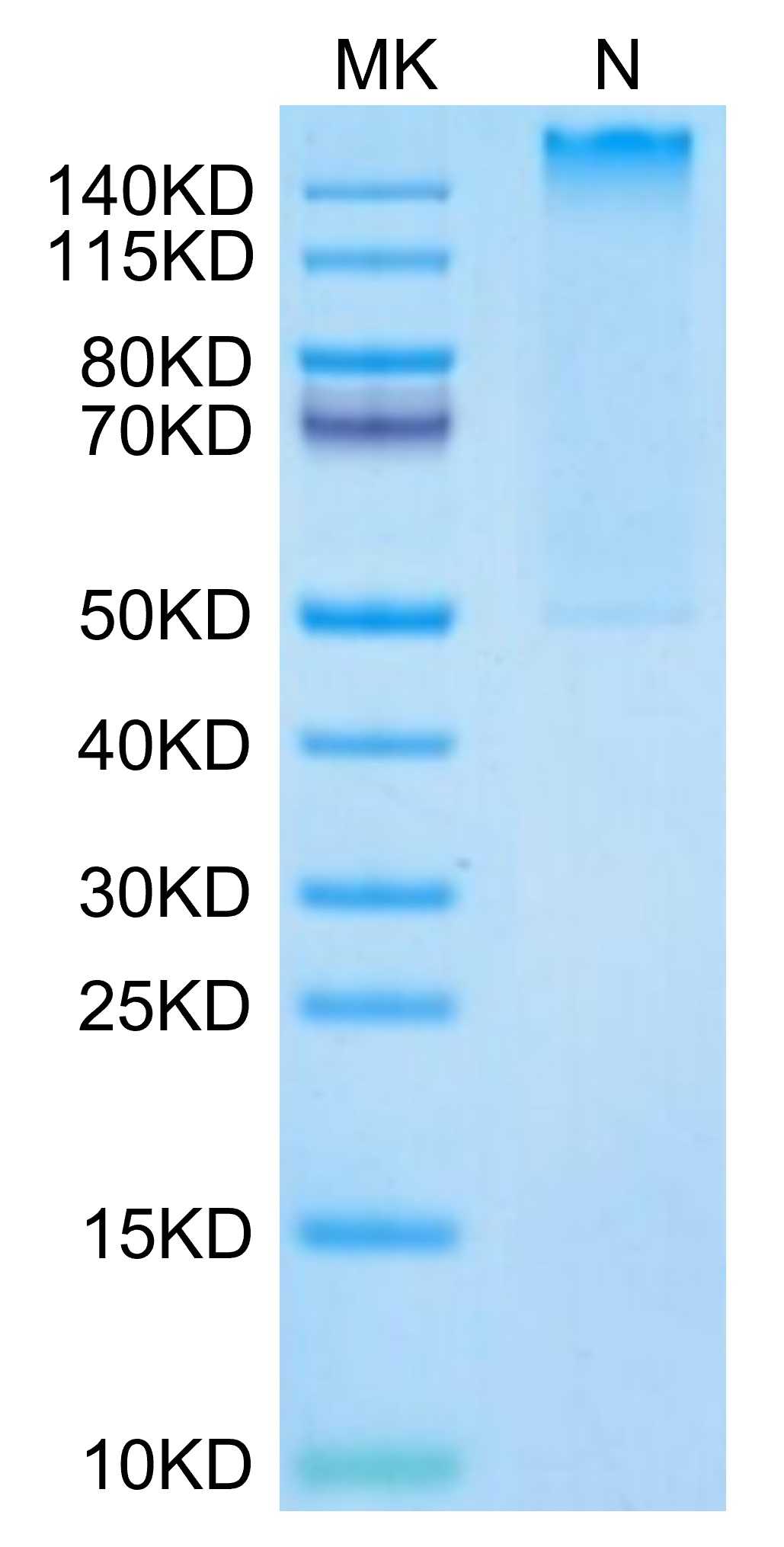 | Molecular Mass : | The protein has a predicted MW of 258 kDa. Due to glycosylation, the protein migrates to 260-265 kDa under Non reducing (N) condition based on Tris-Bis PAGE result. |