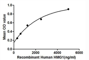 High Mobility Group Protein 1 (HMG1) is among the most important chromatin proteins. In the nucleus HMGB1 interacts with nucleosomes, transcription factors, and histones. This nuclear protein organizes the DNA and regulates transcription. Besides, Stromal Cell Derived Factor 1 (SDF1) has been identified as an interactor of HMG1, thus a binding ELISA assay was conducted to detect the interaction of recombinant human HMG1 and recombinant human SDF1. Briefly, HMG1 were diluted serially in PBS, with 0.01% BSA (pH 7.4). Duplicate samples of 100uL were then transferred to SDF1-coated microtiter wells and incubated for 2h at 37°C. Wells were washed with PBST and incubated for 1h with anti-HMG1 pAb, then aspirated and washed 3 times. After incubation with HRP labelled secondary antibody, wells were aspirated and washed 3 times. With the addition of substrate solution, wells were incubated 15-25 minutes at 37°C. Finally, add 50µL stop solution to the wells and read at 450nm immediately. The binding activity of of HMG1 and SDF1 was shown, and this effect was in a dose dependent manner. |