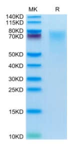 | Molecular Mass : | The protein has a predicted MW of 34.3 kDa. Due to glycosylation, the protein migrates to 70-80 kDa based on Tris-Bis PAGE result. |